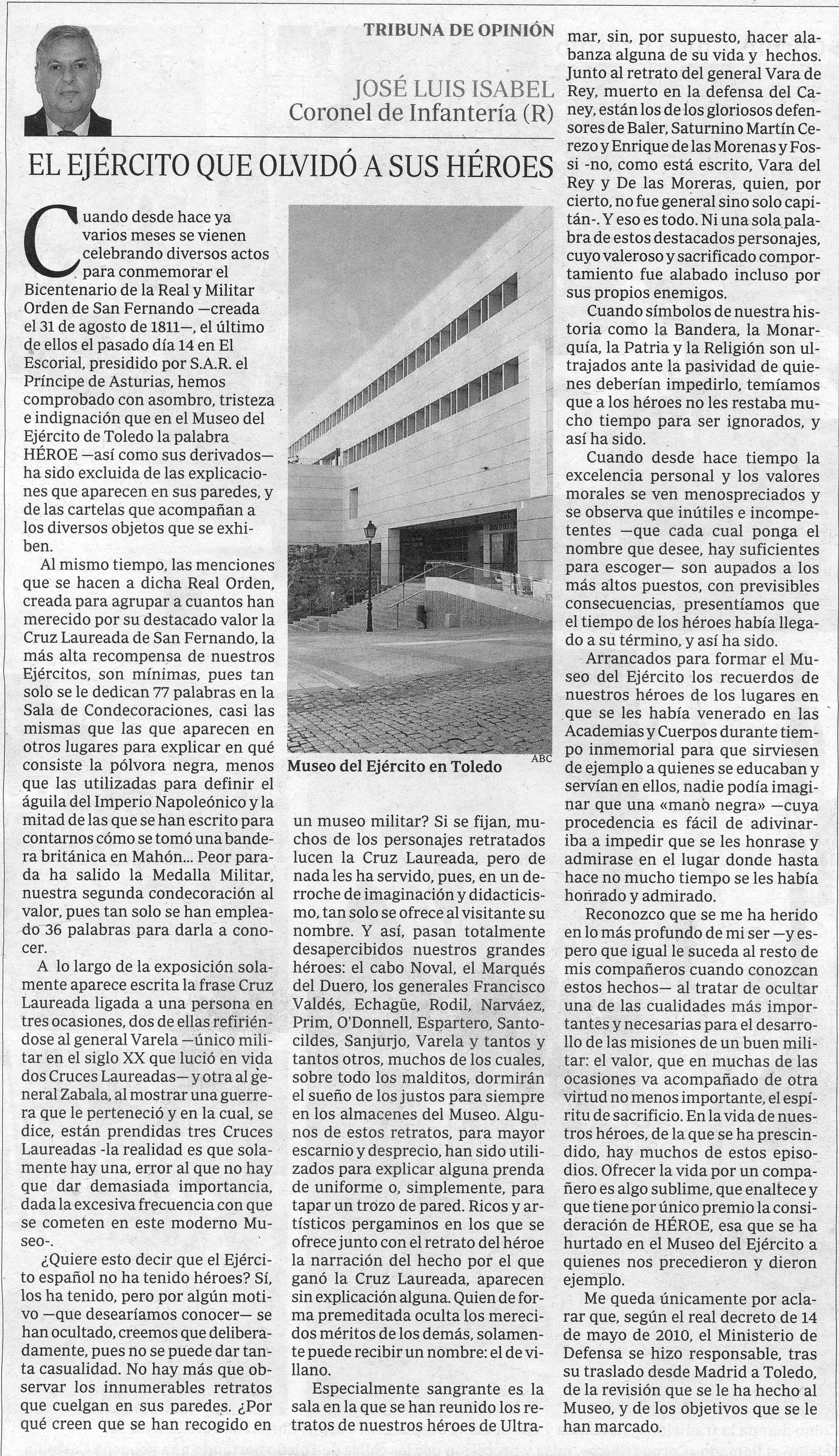 Os dejamos a continuación con el artículo publicado en el diario ABC de don Jose Luis Isabel Sánchez, conferenciante en la Mesa Redonda que tendrá lugar en el día 30 de septiembre en el Ateneo de Madrid.